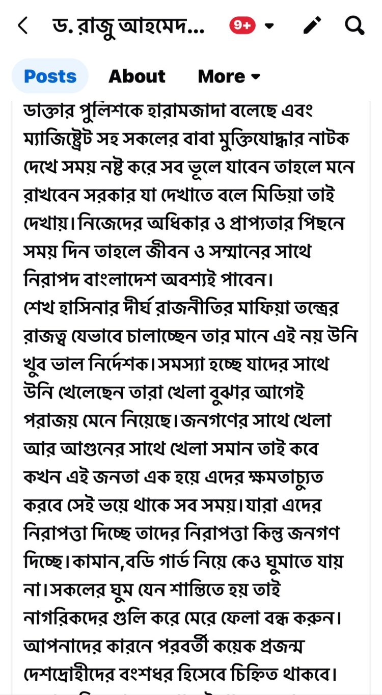 সমগ্র দেশ একটি কারাগার সেখানে অধিকার ফিরে পেতে ও বাঁচতে হলে সবাইকেই #গণঅভ্যুত্থান এ নামতে হবে।দানবের সাথে মানবের শান্তি কখনই হবে না।মাফিয়া মুক্ত নিরাপদ বাংলাদেশের জন্য সবাই প্রস্তুতি নিন।যে যেভাবে পারেন সেভাবেই প্রতিরোধ করুন যেন কেও পালাতে না পারে।এলাকা ভিত্তিক ছোট ছোট গ্রুপ তৈরী করুন যেন দেশদ্রোহীরা বুঝতে পারে তাদের জন্ম স্বাধীন বাংলাদেশে হওয়াটা এ জাতির জন্য একটি পাপ ছিল❗️যে লড়াইটা ১৮ কোটি জনগণের সেখানে রাজনৈতিক দল গুলোর আশায় বসে থাকলে আজীবন অধিকার ছাড়াই নির্যাতনের শিকার হয়ে মরতে হবে।দেশটা সকলের তাই সবাইকেই নামতে হবে একটি নিরাপদ বাংলাদেশের জন্য।যদি মনে করেন ডাক্তার পুলিশকে হারামজাদা বলেছে এবং ম্যাজিষ্ট্রেট সহ সকলের বাবা মুক্তিযোদ্ধার নাটক দেখে সময় নষ্ট করে সব ভূলে যাবেন তাহলে মনে রাখবেন সরকার যা দেখাতে বলে মিডিয়া তাই দেখায়।নিজেদের অধিকার ও প্রাপ্যতার পিছনে সময় দিন তাহলে জীবন ও সম্মানের সাথে নিরাপদ বাংলাদেশ অবশ্যই পাবেন।